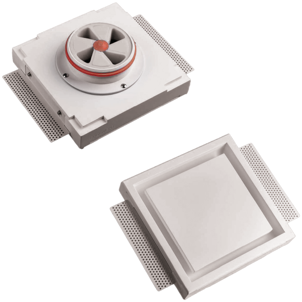 Frameless square diffuser in high quality plaster suitable for installation on plasterboard ceilings or walls. It can be painted the same color as the surface on which it is installed. Connectable with steel, flexible, corrugated ducts and plenum boxes. Can be used on single, double layer or variable thickness plasterboard. Equipped with robust magnetic supports in stainless steel. Side fins for fixing in the stucco.